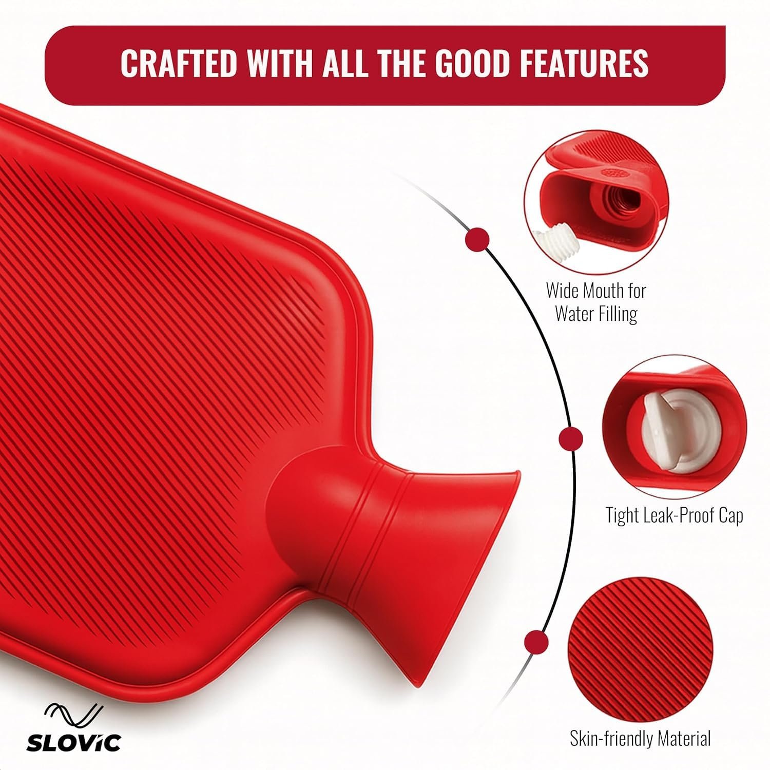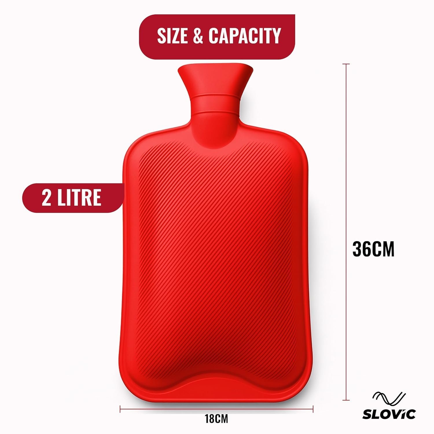 This high-quality natural rubber hot water bottle features a molded, leak-proof opening with a secure stopper for safe and easy filling. The seamless design with embossed surface ensures comfortable skin contact and long-lasting heat retention.